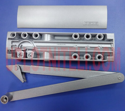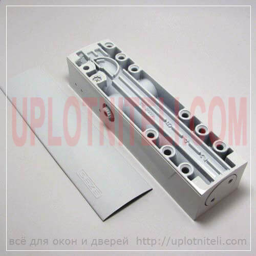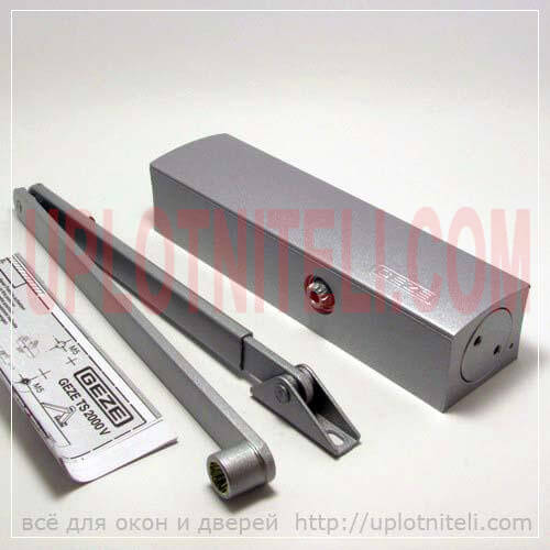 Комплект товара включает: сам доводчик Гезе 4000, зубчатую (рычажную, коленную) тягу к нему, монтажный чертеж и набор для крепления на дверном полотне.