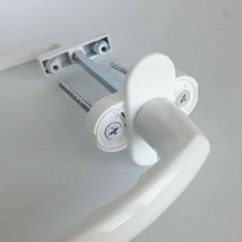 - Стяните внутреннюю и внешнюю ручки винтами, прикройте шляпки винтов поворотом декоративной крышки. Закрепите привод к створке шурупами. Поздравляем, установка двусторонней балконной ручки завершена!